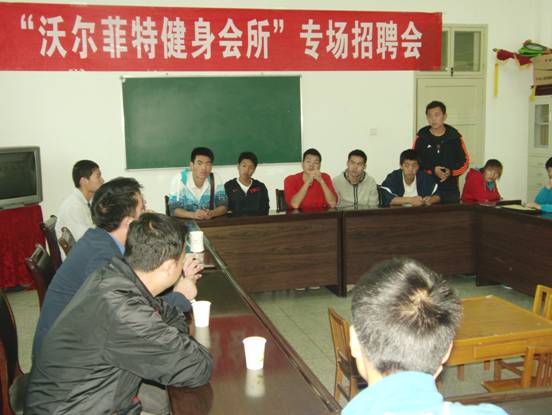 2013年4月22日下午4:00点,在体育系会议室为漳州沃尔菲特健身会所举办了专场招聘会,沃尔菲特健身会所负责人乐建勇、我系党总支书记沈军、辅导员郭建鹏以及30余名我系2013届毕业生和在校生参加了这次招聘会。