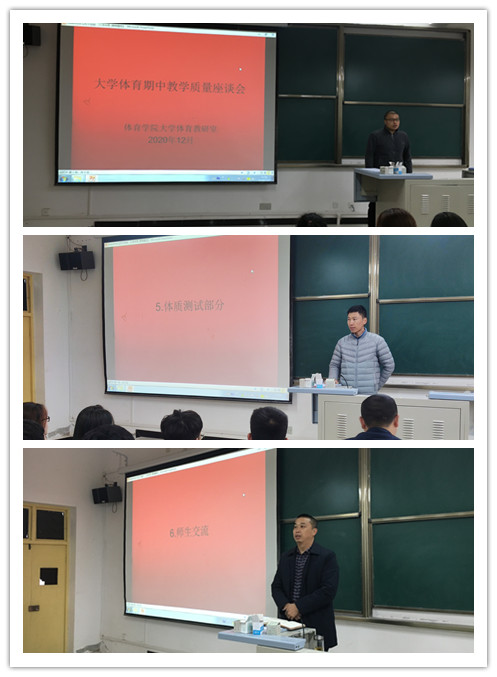 为了进一步提高大学体育教学质量,大学体育教研室于2020年12月2日分别在江北和江南校区召开了大学体育教学质量检查座谈会。会议由教研室主任李强主持,太阳集团tyc539副经理黎远军老师,张凯老师,各二级公司体育部部长、2019和2020级各班班长、体育委员共228名员工参与了座谈会。