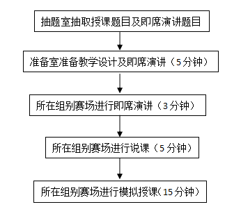 第四项为模拟授课。选手根据自己的教学设计和制作的课件,进行15分钟的模拟授课。大赛流程图: