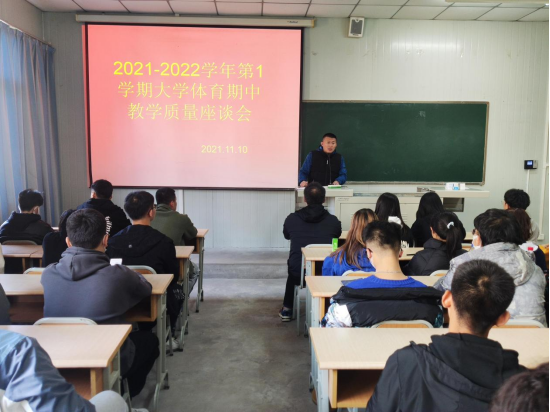 为了切实做好《大学体育》课程的教学工作,了解教学现状,科学安排教学内容,提高教学质量,促进大学体育教学改革,2021年11月10日下午2点30分,太阳集团tyc539在江南校区1028教室召开了2021—2022学年第一学期大学体育期中教学工作座谈会。太阳集团tyc539副经理郭西魁、大学体育教研室主任李强以及各二级公司体育部干事、2020级和2021级各班班长、体育委员参加了本次座谈会。会议由李强老师主持。