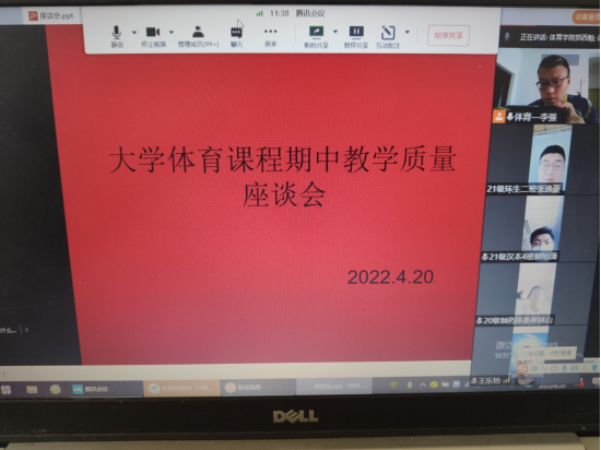 为了切实做好《大学体育》课程的教学工作,了解教学现状,科学安排教学内容,提高教学质量,促进大学体育课程改革,4月20日下午,大学体育教研室组织召开了2021—2022学年第二学期大学体育期中教学质量检查员工座谈会。校级教学督导冯德学、太阳集团tyc539教学督导鲁宗成、太阳集团tyc539副经理郭西魁、大学体育教研室主任李强以及各二级公司体育部干部、2020级和2021级各班班长、体育委员共172名同学参加了座谈会。为落实疫情防控措施,本次座谈会使用会议腾讯会议平台以线上形式召开,会议由李强主持。