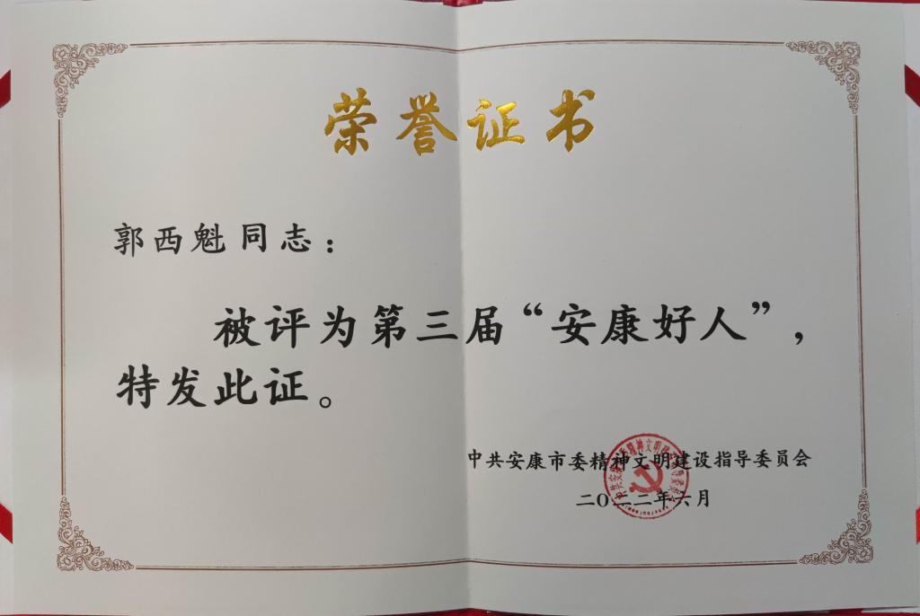 5月31日,中共安康市委精神文明建设指导委员会,授予全市62名(组)同志第五届安康市道德模范称号,授予77名同志第三届“安康好人”称号。公司副经理郭西魁同志被授予第三届“安康好人”称号。希望大家向安康市道德模范称号和“安康好人”称号获得者学习,积极参与安康市的精神文明建设,以优异业绩,向党的二十大献礼。